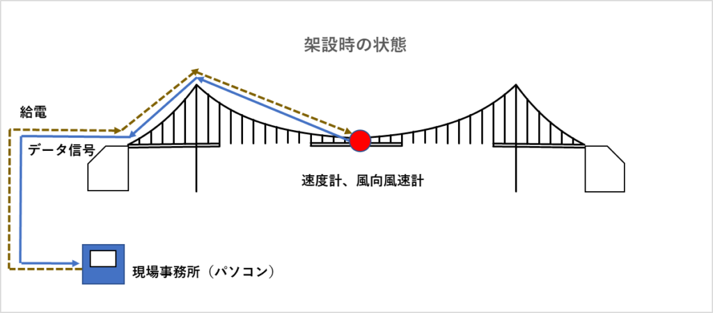 計測機への給電は、建設工事中であったため桁上から安定的な電力が供給できず、データケーブルに並行したケーブルで陸から行うこととしました。結局、電源/データ信号用のケーブルを管理棟ーアンカレッジー塔頂ー桁中央のルートで配線し、計1kmほどとなりました。